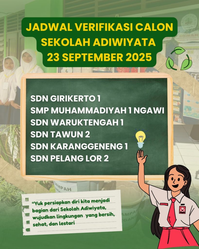 Senin (22/09) Dinas Lingkungan Hidup Kabupaten Ngawi kembali melaksanakan penilaian lapangan Calon Sekolah Adiwiyata Kabupaten. Memasuki minggu terakhir penilaian, seluruh peserta masih menunjukkan semangat yang luar biasa. 💚