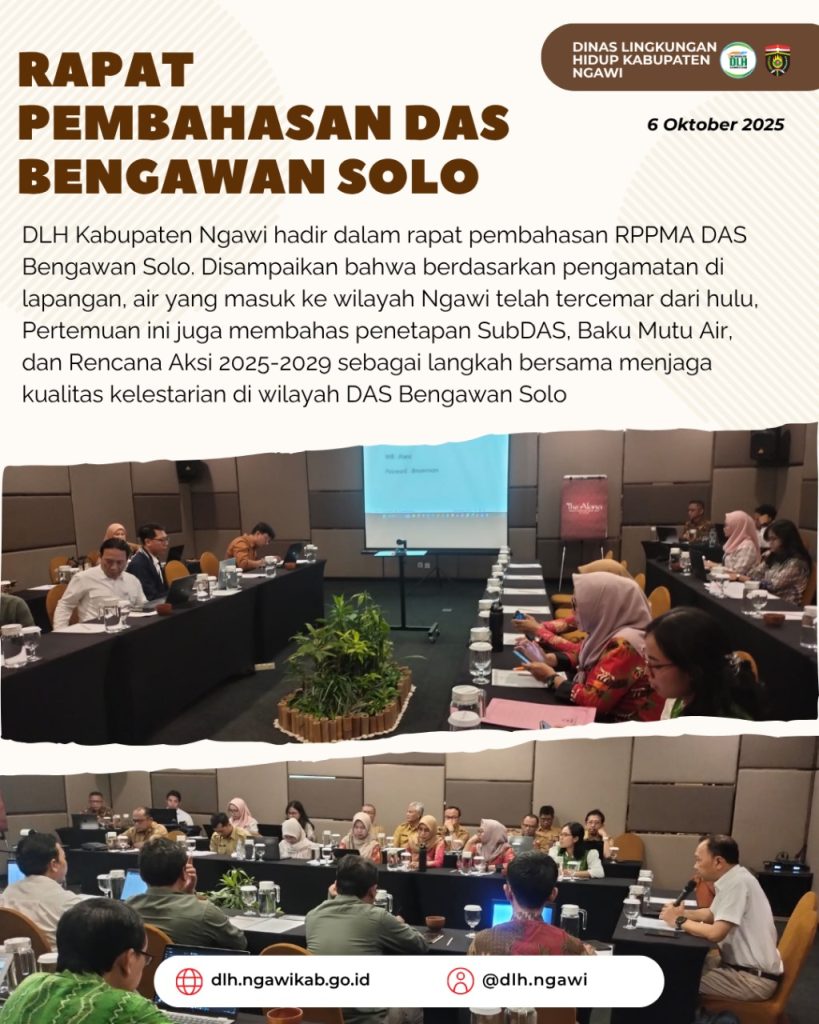 Hari ini (6 Oktober 2025), DLH Kabupaten Ngawi turut serta dalam Rapat Pembahasan Rancangan Keputusan Menteri Lingkungan Hidup dan Kehutanan tentang Rencana Perlindungan dan Pengelolaan Mutu Air (RPPMA) Daerah Aliran Sungai Bengawan Solo.
