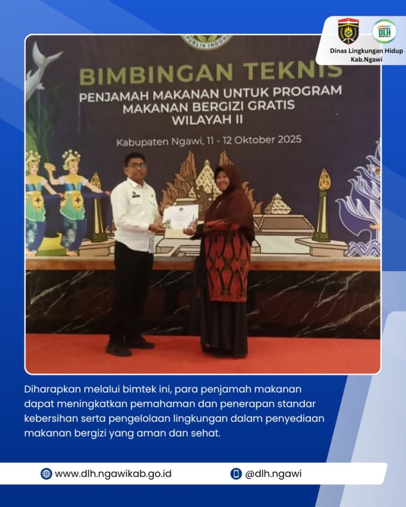 Dinas Lingkungan Hidup Kabupaten Ngawi yang diwakili oleh Ibu Bulkis Hani Restu Luhur, SKM., M.MKes selaku Kepala Bidang PSLB3 turut berpartisipasi sebagai narasumber dalam kegiatan Bimbingan Teknis (Bimtek) Penjamah Makanan untuk Program Makanan Bergizi Gratis Wilayah III. Kegiatan ini digelar di Hotel Nata, Ngawi, selama dua hari, pada 11–12 Oktober 2025.