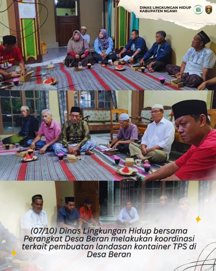Dinas Lingkungan Hidup Kabupaten Ngawi bersama Perangkat Desa Beran melakukan koordinasi terkait pembuatan landasan kontainer TPS di Desa Beran sebagai langkah menjaga kebersihan Saluran Ketonggo.