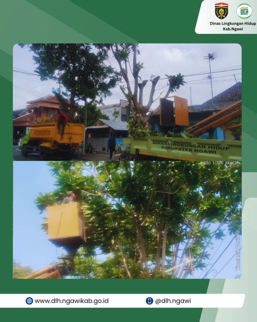 (20/10) Sebagai langkah antisipasi menghadapi cuaca ekstrem, Dinas Lingkungan Hidup Kabupaten Ngawi melaksanakan kegiatan pemangkasan rutin pohon di sepanjang Jalan Teuku Umar.
